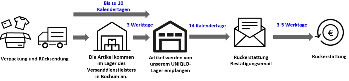 - Wenn du deine Rückerstattung nicht innerhalb des angegebenen Zeitraums erhältst, gib bitte deine Bestellnummer an und kontaktiere den UNIQLO Kundenservice.